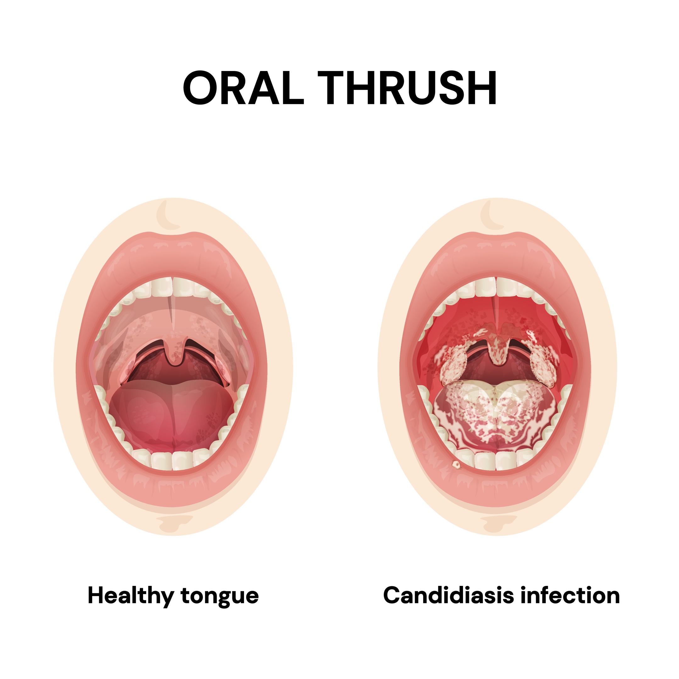 In the mouth, infection is known as oral thrush, which causes white, creamy patches on the tongue, inner cheeks, and roof of the mouth. These patches may be painful and can bleed slightly if scraped. Symptoms can also include soreness, difficulty swallowing, or a burning feeling in the mouth.