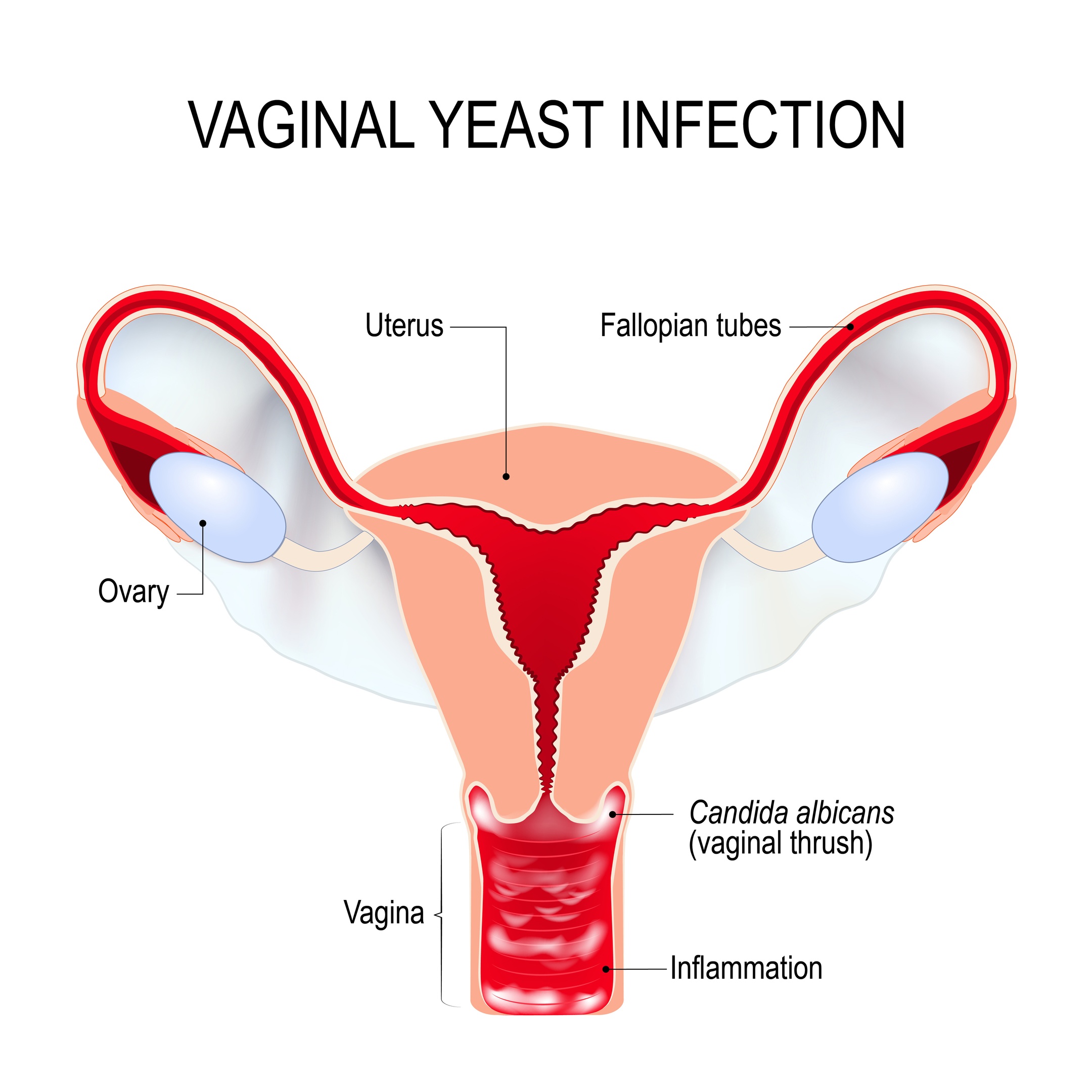 As the yeast grows in and spreads, it irritates the surrounding tissues, which triggers an inflammatory response. This inflammation causes redness, swelling, itching, and irritation. In vaginal infections, thick white discharge often appears because the yeast and immune cells mix with shed epithelial cells. Some people also experience pain during urination or intercourse. On the skin, the infection causes a red, itchy rash, often in warm and moist areas like under the breasts, in the groin region, or between skin folds.